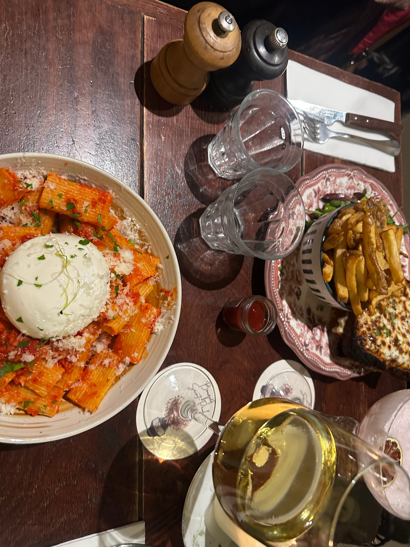 Pas toujours facile de trouver un lieu pour dîner en date ou juste boire un verre avec un vieil ami à Paris. Oui, le choix ne manque pas, mais justement, comment se différencier ! C’est pourquoi j’avais envie de vous parler du Bouquet Saint-Paul, un lieu à la décoration florale n’est jamais too much et la carte se veut certes basique mais de qualité. Avec mon amie, on se partage un croque-monsieur (son tout premier !) à la truffe. Cela ne déçoit jamais. De mon côté, j’opte pour des rigatoni avec de la burrata – pas de faux pas ou de risque, on vous avait prévenus.