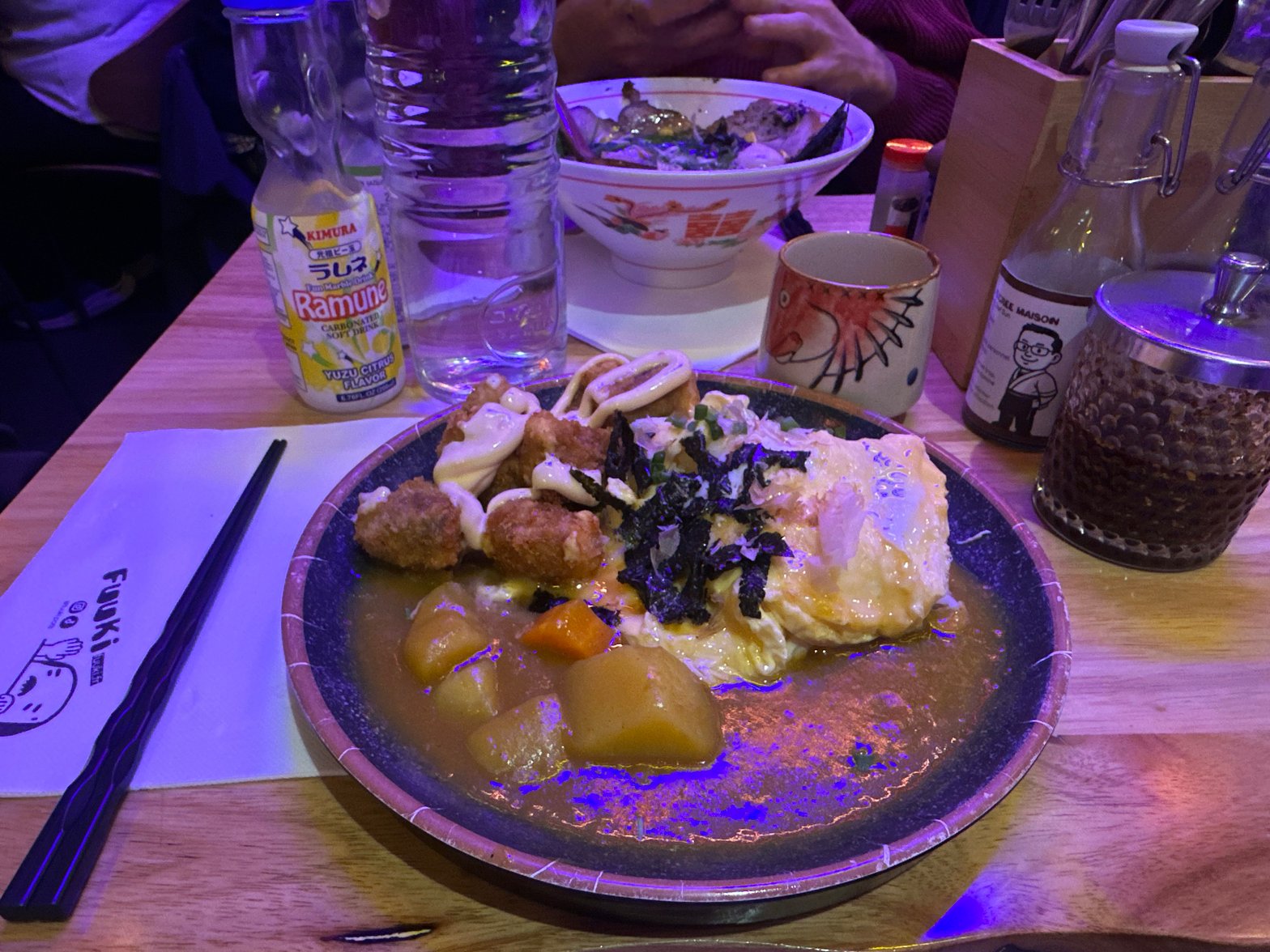 Enfin, l’autrice de ces lignes quitte son 20ᵉ et Opéra ! Toujours à Paris, certes, mais direction le 13e, côté Bibliothèque François Mitterrand, pour aller à Fuuki, dans ce restaurant japonais déjà quasi full un lundi soir à 19 h. Si ça, ce n’est pas un bon signe. J’opte pour une création : un omurice, cette fameuse et généreuse omelette qui enveloppe du riz, avec un peu de curry et des boulettes bœuf-cheese. Oui, ça fait beaucoup d’infos, dans mon estomac comme dans mon cerveau. Mais le tout passe très bien. De manière générale, je vous conseille d’essayer les spécialités du menu, très intrigantes. J’ai notamment vu un ramen au pesto… Hérésie ou génie ? À tester pour la prochaine fois, donc !