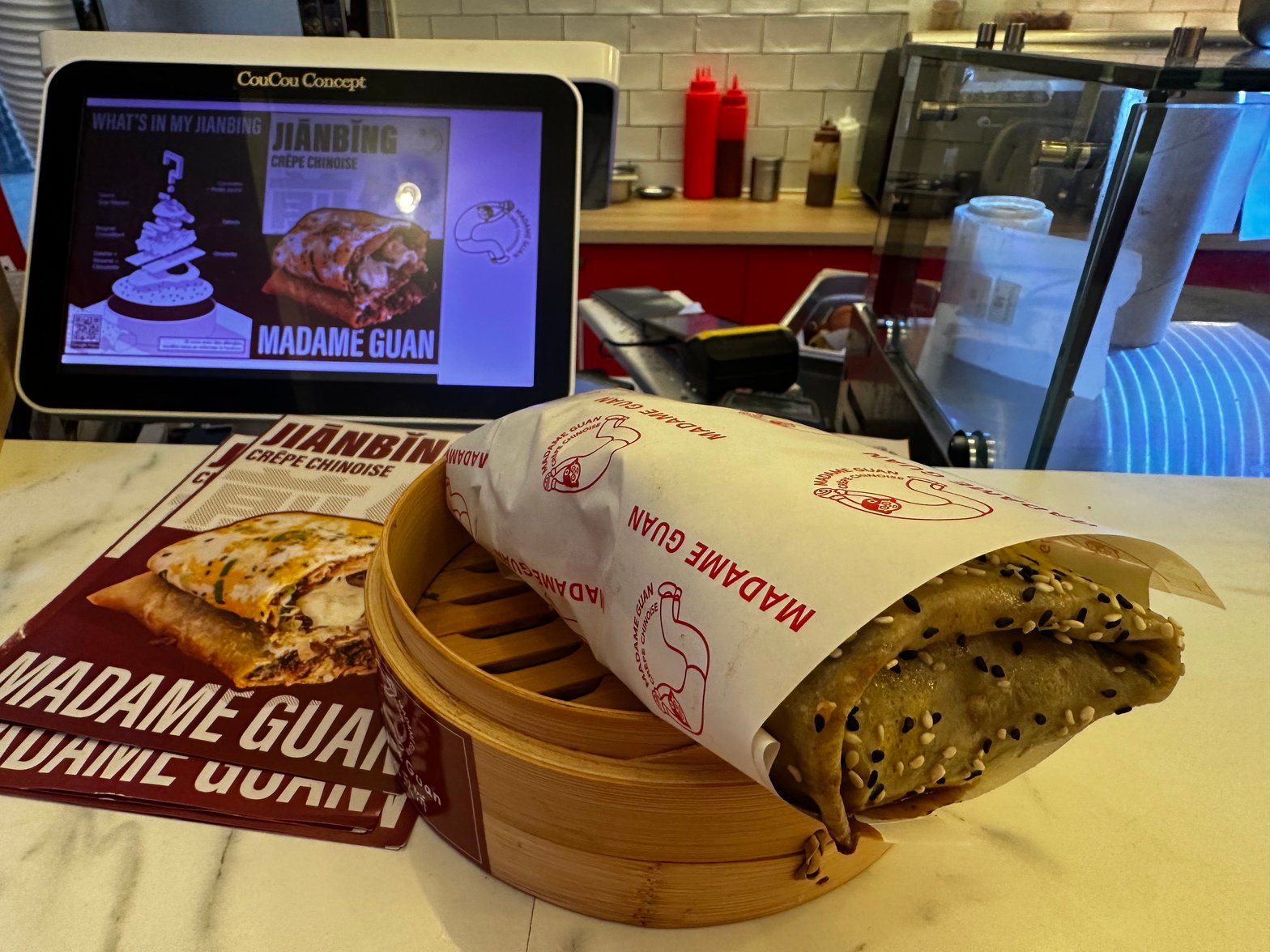 Suis-je déjà allée en Chine ? Oui. Ai-je pu en profiter pour croquer les fameuses crêpes locales, les jianbing ? Qu’une seule fois et pas une de plus. Pas grave, Madame GUAN, qui propose déjà quatre adresses à Paris et une grosse notoriété sur les réseaux, saura me satisfaire. Au menu, les classiques (poulet, végé) mais aussi des plus extravagantes et adaptées au goût des Français. Il y a donc une version avec des frites, en mode tacos, mais aussi bœuf-fromage ! La plus généreuse selon l’équipe qui me conseille. Je les suis et en effet c’est très gourmand, surtout en fromage. Difficile à manger avec élégance, mais qu’importe, nous sommes là pour nous goinfrer, pas pour devenir une lady Bridgerton. Je m’en mets partout, utilise facile quatre serviettes pour essuyer mes lèvres, et me lèche même les doigts. Très, très bon signe, mais pour une toute première fois, je recommande tout de même les classiques, histoire d’aller crescendo au gré de vos retours.